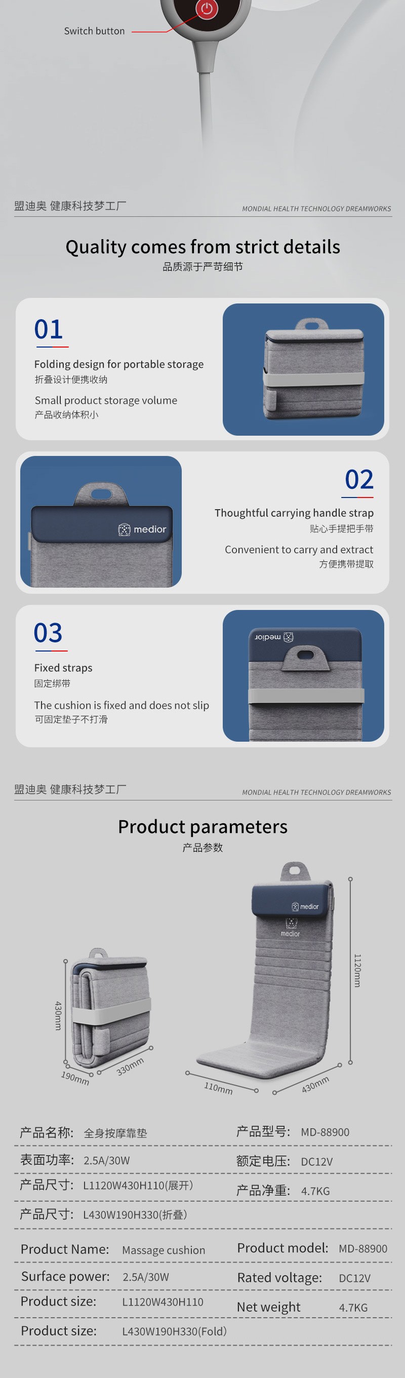 3、力度三檔調(diào)節(jié),定點(diǎn)按摩,腰背按摩、臀腿按摩、全背按摩模式選擇