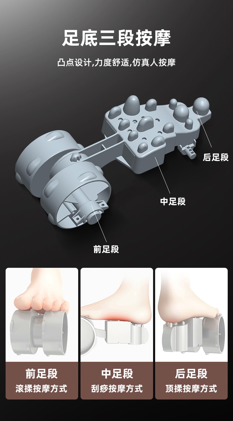 腳底 滾輪按壓(腳趾)、刮痧(腳底)、頂(腳后跟)按摩 (多模式,多強度)